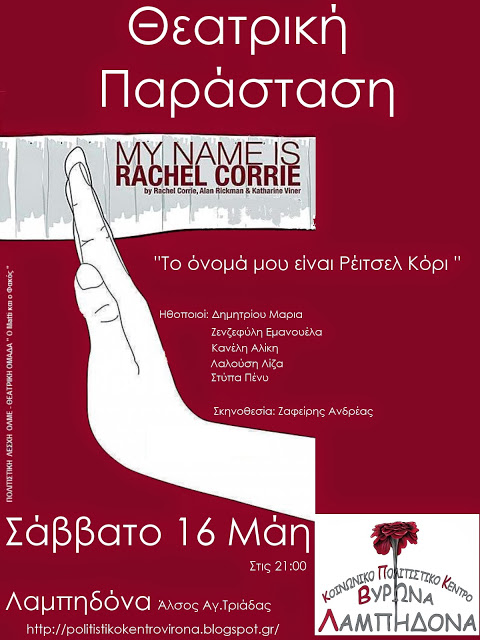 To Κοινωνικό Πολιτιστικό Κέντρο Βύρωνα σας προσκαλεί το Σαββατο 16 Μάη στις 21:00 στην θεατρική παράσταση ''Το όνομα μου είναι Rachel Corrie'' απο την θεατρικη ομάδα ''Ο Matti και ο Φακος''.