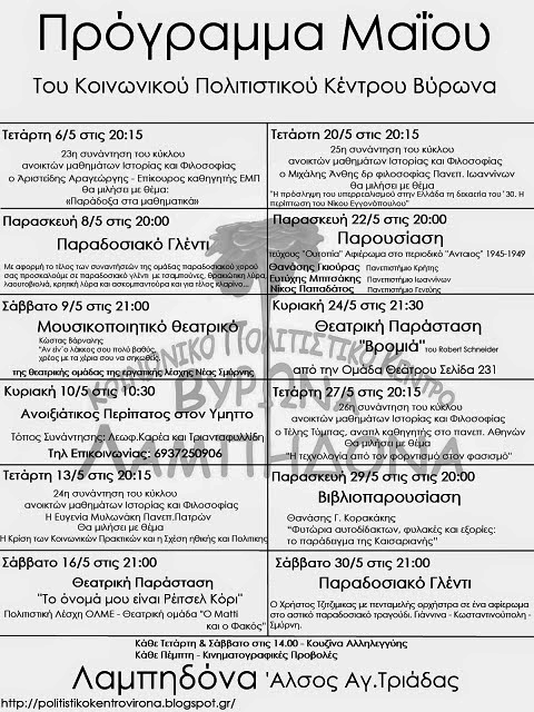 Ο Μάιος είναι ένας πολύ πλούσιος μήνας με δραστηριότητες στην Λαμπηδόνα. Δειτε την παρακάτω αφίσα και θα καταλάβετε γιατί...