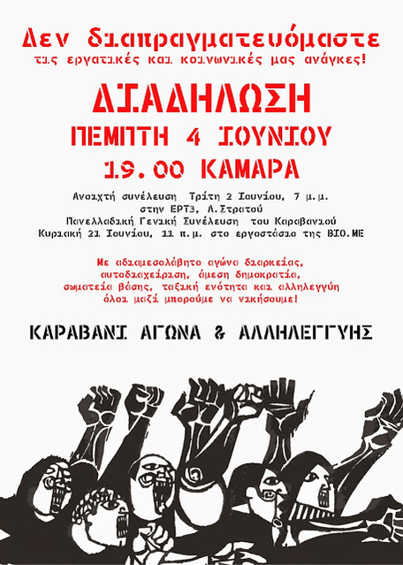 Το Καραβάνι Αγώνα & Αλληλεγγύης που ξεκίνησε εδώ και λίγους μήνες είναι μια ενότητα «από τα κάτω» και αφορά την κοινή δράση εκατοντάδων εργαζομένων και ανέργων απ' όλη την Ελλάδα. Το Καραβάνι που πλαισιώνεται συνεχώς από νέους αγώνες, αποτελείται από ανθρώπους εργατικών/κοινωνικών συλλογικοτήτων και αγωνιστές που αποφάσισαν να πορευτούν όρθιοι και να διεκδικήσουν δυναμικά τα δικαιώματά τους αρνούμενοι να αποδεχτούν τη λογική της ανάθεσης και του «τέλους της ιστορίας». Οι πραγματικές αιτίες της κοινωνικής καταστροφής που βιώσαμε τα τελευταία χρόνια δεν θα ακυρωθούν αν εμείς δεν αυτενεργήσουμε για να τις καταργήσουμε στην πράξη μέσα από νέους ακηδεμόνευτους αγώνες.