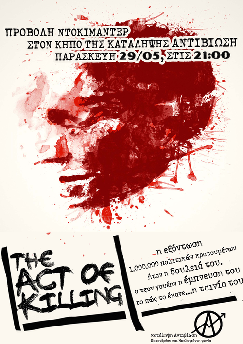 Προβολή του ντοκιμαντέρ "The Act of Killing" την Παρασκευή 29/05, στις 21:00 στον κήπο της κατάληψης Αντιβίωση.