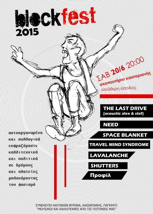 Blockfest 2015 Πέρασε ένας χρόνος από τη πρώτη μας απόπειρα να συνταιριάξουμε το πολιτιστικό με το πολιτικό στοιχείο στις γειτονιές που ζούμε, δρούμε και δημιουργούμε. Καταθέσαμε όλοι μαζί τη κοινή καλλιτεχνική και πολιτική μας οπτική, μέσα από το κοινό αντιφασιστικό πρίσμα που μας ενώνει και έτσι δημιουργήσαμε το Blockfest. Δεύτερη χρονιά, δεύτερη απόπειρα να φέρουμε κοντά ό,τι αγκαλιάζει τις περιοχές μας και τους δίνει ρυθμό. Σε όσα αποπνέουν οι ιδέες μας και τους δίνουν σχήμα και μορφή, η δημιουργική έκφραση, όπως η μουσική τέχνη. Φέτος το blockfest θα πραγματοποιηθεί το Σάββατο 20 Ιούνη στο Σκοπευτήριο της Καισαριανής με Rock μουσική και με τη συμμετοχή και μουσικών σχημάτων από τις γειτονιές μας. Πάμε ξανά αυτοοργανωμένα, αντιιεραρχικά και συλλογικά, χωρις είσοδο και χορηγούς, για ένα φεστιβάλ που θα δώσει το μήνυμα μέσα από τους δημόσιους χώρους, εκεί που ζεί και μπορεί να μεγαλώνει το αίσθημα της ελευθερίας και της αντιθεσμικότητας. Είναι βέβαιο , πώς αυτοί οι χώροι διεκδικούνται και κερδίζονται κάθε μέρα, με παρουσία μόνιμη και εμφατική. Μόνιμο στοίχημα για εμάς παραμένει, η όσο μεγαλύτερη διεύρυνση του κύκλου των ανθρώπων που εμπλέκονται με το εγχείρημα. Το φεστιβάλ αυτό, άλλωστε, στήνεται εξ΄αρχής από κοινού με τη συνέλευση Κατοίκων ΒΚΠ, των δημιουργών και με το κόσμο που θέλει να συμμετέχει με οποιοδήποτε τρόπο σ' αυτό. Με το βλέμμα στο μέλλον, ώστε η κίνηση αυτή να δώσει καρπούς για μια πιο ουσιαστική συνάντηση και σύσφιξη των σχέσεων μεταξύ της αυτοοργανωμένης πολιτικής δράσης και της ελεύθερης καλλιτεχνικής δημιουργίας στις γειτονιές μας. Κάνοντας, ταυτόχρονα, ξεκάθαρο πως εδώ στις γειτονιές της προσφυγιάς, της περήφανης αντίστασης στους ναζί και των (εκτελεσθέντων) αγωνιστών που αντιμετώπησαν ως και το θάνατο με καθάριο βλέμμα, δεν θα επιτρέψουμε οποιαδήποτε φασιστική λογική και πρακτική να βρεί ούτε χιλιοστό να ακουμπήσει. Αντιθέτως θα συμπιέζεται στο Τίποτα. Συνέλευση Κατοίκων Βύρωνα Καισαριανής Παγκρατίου