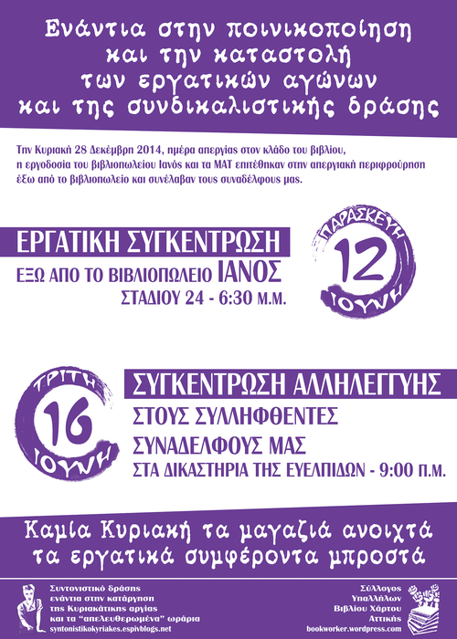 Κείμενο και αφίσα εν όψει της δίκης από την Κυριακάτικη απεργιακή περιφρούρηση στο βιβλιοπωλείο "ΙΑΝΟΣ" [28-12-15]
