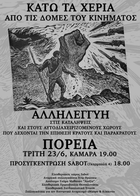 Οι ελεύθεροι κοινωνικοί χώροι, οι καταλήψεις, τα αυτοοργανωμένα εγχειρήματα είναι κομμάτια των κοινωνικών αγώνων ενάντια σε κράτος και κεφάλαιο. Με όπλο μας την αλληλεγγύη τα υπερασπιζόμαστε!