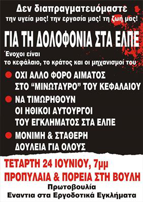 Καλούμε τους εργαζόμενους στα ΕΛΠΕ, κάθε εργαζόμενο και άνεργο, κάθε αγωνιστή και ευαισθητοποιημένο πολίτη να ενώσουν τη γροθιά τους μαζί μας σε ένα μαζικό μαχητικό συλλαλητήριο την Τετάρτη στις 24 Ιουνίου στο Υπουργείο Εργασίας και τη Βουλή.