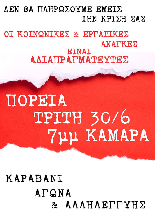 - Πορεία με κεντρικό σύνθημα "Δεν θα πληρώσουμε εμείς την κρίση σας, οι εργατικές και κοινωνικές ανάγκες είναι αδιαπραγμάτευτες Τρίτη 30/6 στις 7 από την Καμάρα.