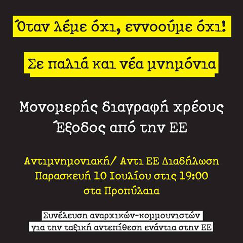 Όταν λέμε ΟΧΙ εννοούμε ΟΧΙ: Αντιμνημονιακή - ΑντιΕΕ Διαδήλωση, Παρασκευή 10 Ιούλη στις 7μμ, Προπύλαια