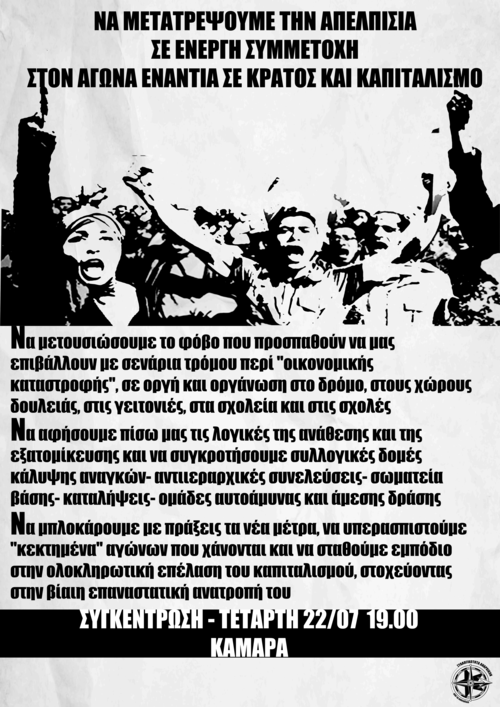 Την Τετάρτη 22 Ιουλίου το πιο δυνατό χαρτί των αστών, αυτό που ονομάστηκε "αριστερή κυβέρνηση" φέρνει στη βουλή ότι δεν κατόρθωσαν να συμπεριλάβουν οι προηγούμενες κυβερνήσεις στα πρώτα 2 μνημόνια. Πλειστηριασμοί πρώτης κατοικίας, συνολική αλλαγή στον πτωχευτικό κώδικα ώστε να αποζημιώνονται κυρίως οι τράπεζες, αντί των εργαζομένων, οριστική διάλυση του αγροτικού τομέα ώστε να μην μπορεί ο λαός να στραφεί ούτε στη γη για να ανταπεξέλθει στην κοινωνική γενοκτονία που ετοιμάζουν από κοινού αριστεροί και δεξιοί. Αν και έκαναν τα πάντα για να φέρουν το νέο μνημόνιο μέσα στο κατακαλόκαιρο, θα είμαστε παρόντες στο νέο ραντεβού της αντίστασης. Μαζί με τον κόσμο που δεν σταματά να αγωνίζεται χωρίς αναθέσεις και σωτήρες, χτίζουμε ξανά τα πρώτα ορύγματα που θα γεμίσουν από τους καταπιεσμένους. Στο τέλος εμείς θα νικήσουμε. Δεν θα περάσουν.