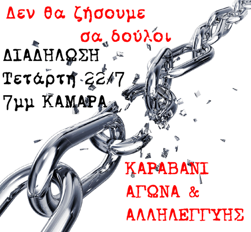 Το ΚΑΡΑΒΑΝΙ ΑΓΩΝΑ & ΑΛΛΗΛΕΓΓΥΗΣ, μία αμεσοδημοκρατική, ακηδεμόνευτη και συνεχώς διευρυνόμενη συσπείρωση εργατικών και κοινωνικών δυνάμεων από πληττόμενους κλάδους σε ιδιωτικό και δημόσιο τομέα, πέρα κι έξω από τις συστημικές λογικές της διαπραγμάτευσης των εργατικών και κοινωνικών μας αναγκών, ενώνει τη φωνή του με τις μαχόμενες δυνάμεις της χώρας που επιμένουν να λένε ΟΧΙ στην ομηρία των τραπεζιτών και των πολιτικών τους υπαλλήλων.