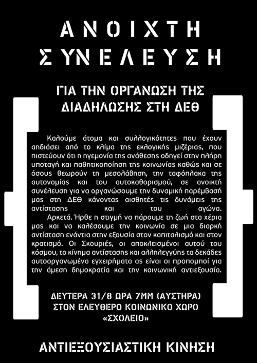 "Σχολείο για τη Μάθηση της Ελευθερίας" Ελεύθερος Κοινωνικός Χώρος (πρώην 12ο Δημοτικό Σχολείο Θεσσαλονίκης) Βασ. Γεωργίου με Μπιζανίου λεωφορεία 3,5,6,7,8,10,11,31,33,39,58 στάση ΕΥΖΩΝΩΝ (περιοχή Φάληρο)