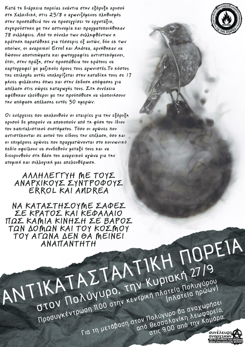 Η συνέλευση αλληλεγγύης στους αναρχικούς συντρόφους Αντρέα και Ερρόλ καλεί αντικατασταλτική πορεία στον Πολύγυρο, την Κυριακή 27/9.