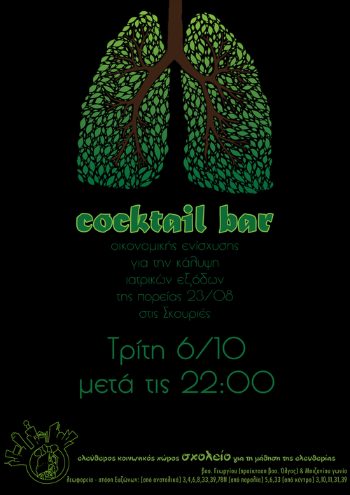 Στις 6/10 22:00 θα πραγματοποιηθεί cocktail μπαρ οικονομικής ενίσχυσης ώστε να καλυφθούν περαιτέρω ιατρικά έξοδα για τραυματισμούς στην πορεία 23/8 στις Σκουριές.