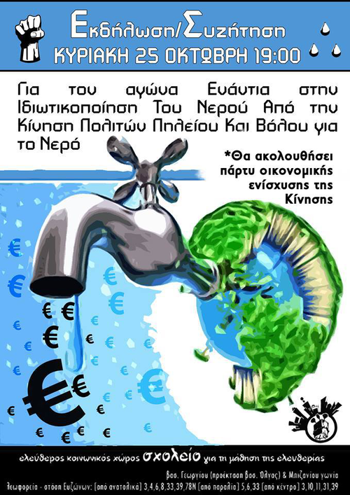 Την Κυριακή 25/10 στις 19:00 θα πραγματοποιηθεί συζήτηση/εκδήλωση με θέμα τον αγώνα ενάντια στην ιδιωτικοποίηση του νερού από την Κίνηση Πολιτών Πηλίου και Βόλου για το νερό.