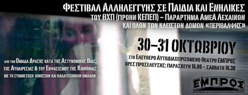Σκοπός του διήμερου φεστιβάλ Αλληλεγγύης σε Παιδιά και Ενήλικες του ΘΧΠ (πρώην ΚΕΠΕΠ) - Παράρτημα ΑμεΑ Λεχαινών, και όλων των κλειστών δομών «περίθαλψης», που γίνεται 30 - 31 Οκτωβρίου 2015, στο Ελεύθερο Αυτοδιαχειριζόμενο Θέατρο Εμπρός, Ρήγα Παλαμήδη 2, στου Ψυρρή, είναι να συνεκπαιδευτούμε και να δικτυωθούμε, με στόχο την κλιμάκωση δράσεων αντίστασης στον ιδρυματισμό κάθε τύπου, στον αποκλεισμό των αναπήρων, με την ιατρικοποιήση της αναπηρίας, στο διαρκές έγκλημα του Κρατικού Συστήματος «Υγείας» και καταστολής, «Πρόνοιας» και καταπάτησης όλων των ανθρωπίνων δικαιωμάτων…
