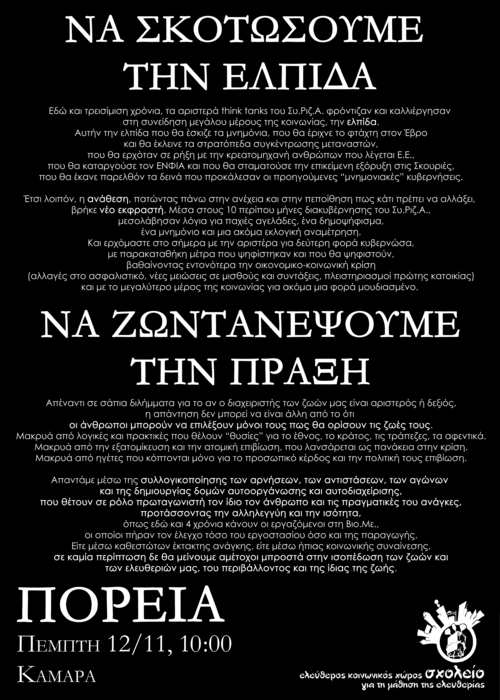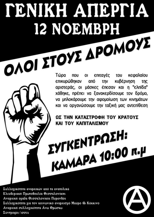 Οπότε με αρχή τη 12η Νοεμβρίου και με συνέχεια την πορεία για το Πολυτεχνείο στις 17 Νοεμβρίου, το δικαστήριο για τον πλειστηριασμό της ΒΙΟΜΕ, την πορεία για την επέτειο του θανάτου του Αλέξανδρου Γρηγορόπουλου στις 6 Δεκεμβρίου, τις κινήσεις υπεράσπισης του δάσους στις Σκουριές, τις δράσεις αλληλεγγύης στους μετανάστες, τους αποκλεισμούς καταστημάτων και την απεργιακή περιφρούρηση της Κυριακάτικης αργίας, τις διαδηλώσεις και τις καταλήψεις στις σχολές και στα σχολεία, τις παρεμβάσεις για τους φυλακισμένους επαναστάτες, πρέπει να φέρουμε σε επαφή τους διάσπαρτους αγώνες και να δομήσουμε ένα αντιιεραρχικό και αντιθεσμικό κίνημα που εκτός από ανάχωμα στην υποτίμηση των ζωών μας στο όνομα της κρίσης θα βάζει πλέον ως στρατηγικό στόχο την καταστροφή κράτους και καπιταλισμού, την ατομική και συλλογική απελευθέρωση.
