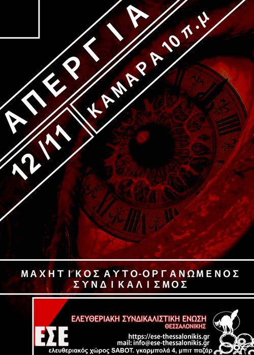Η ημέρα της απεργίας αποτελεί για εμάς μια ευκαιρία να βρεθούμε στον δρόμο μαζί με τους συναδέλφους μας, να μοιραστούμε βιώματα και εμπειρίες και να οργανώσουμε καλύτερα την αντίστασή μας ενάντια στη λεηλασία των ζωών μας. Επιθυμούμε να ξαναδώσουμε στην απεργία το πραγματικό νόημά της, δηλαδή το μπλοκάρισμα της παραγωγικής διαδικασίας. Στεκόμαστε απέναντι στον γραφειοκρατικό συνδικαλισμό (ΓΣΕΕ, ΑΔΕΔΥ, ΠΑΜΕ), θεωρώντας ότι οι εργατικοί αγώνες και οι διεκδικήσεις των εργαζομένων είναι έργο των ίδιων και όχι των δήθεν εκπροσώπων τους, οι οποίοι τις περισσότερες φορές απλά συμβάλουν στην αφομοίωση και εκτόνωση αυτών των αγώνων.