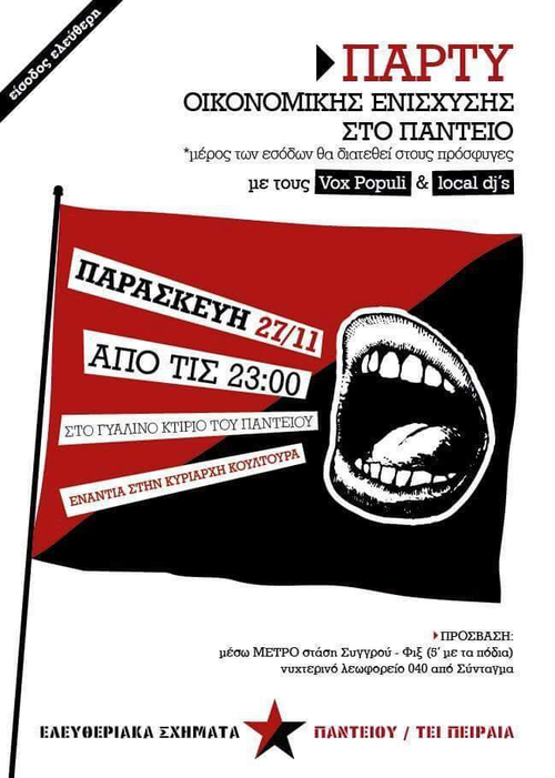 Τα Ελευθεριακά Σχήματα Παντείου και ΤΕΙ Πειραιά, σας προσκαλούν στο πάρτυ οικονομικής ενίσχυσης για την κάλυψη των εξόδων τους. Οι καιροί είναι χαλεποί, αλλά εμείς αντιστεκόμαστε σθεναρά!