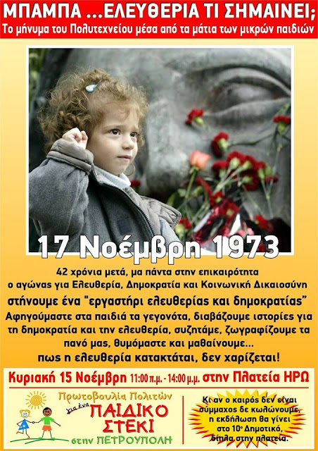 Το μήνυμα του Πολυτεχνείου μέσα από τα μάτια των μικρών παιδιών. 45 χρόνια μετά, μα πάντα στην επικαιρότητα, ο αγώνας για ελευθερία, δημοκρατία και κοινωνική δικαιοσύνη. Στήνουμε ένα "εργαστήρι ελευθερίας και δημοκρατίας". Αφηγούμαστε στα παιδιά τα γεγονότα, διαβάζουμε ιστορίες για τη δημοκρατία και την ελευθερία, συζητάμε, ζωγραφίζουμε τα πανό μας, θυμόμαστε και μαθαίνουμε πως η ελευθερία κατακτάται, δε χαρίζεται!