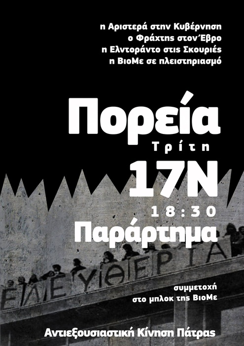 Η Αντιεξουσιαστική Κίνηση Πάτρας στηρίζει και συμμετέχει στο μπλόκ της Πρωτοβουλίας Αλληλεγγύης στη ΒΙΟ.ΜΕ Πάτρας την Τρίτη 17 Νοέμβρου στις 6.00 μ.μ. στο Παράρτημα