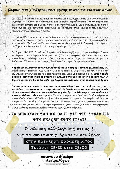 Την Πέμπτη 12/11/2015 οι ελληνικές αρχές εισέβαλαν στα σπίτια μας, και μας συνέλαβαν δυνάμει του Ευρωπαϊκού Εντάλματος Σύλληψης που εξέδωσε η εισαγγελική αρχή του Μιλάνου, με το οποίο ζητά τη σύλληψη και την έκδοση μας στην Ιταλία, λόγω της συμμετοχής μας στη διαδήλωση. Σύμφωνα με το ένταλμα, ''θεαθήκαμε'' να συμμετέχουμε σε επεισόδια.