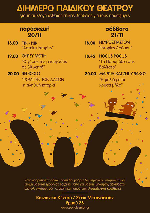 Κατά το διήμερο των παραστάσεων θα συλλέγονται τρόφιμα και χειμωνιάτικα ρούχα για τους πρόσφυγες στην Ειδομένη. Συγκεκριμένα οι σημαντικότερες αυτή τη στιγμή ανάγκες είναι παστέλια, μπάρες δημητριακών,, ατομικοί χυμοί, έτοιμη βρεφική τροφή σε βαζάκια, γάλα για βρέφη, μπουφάν, αδιάβροχα, κασκόλ, σκούφοι, γάντια, αθλητικά παπούτσια, ελαφριές φλις κουβέρτες