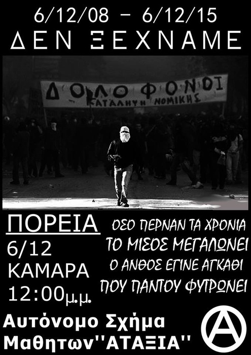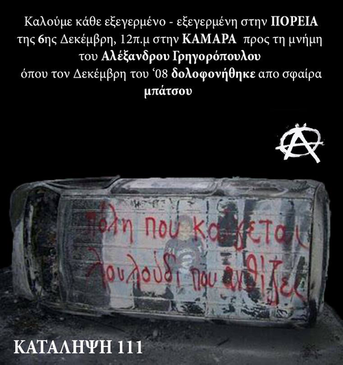 Καλούμε κάθε εξεγερμένο και εξεγερμένη στην πορεία της 6ης Δεκέμβρη, στις 12:00 πμ στην Καμάρα, προς τη μνήμη του Αλέξανδρου Γρηγορόπουλου που δολοφονήθηκε από σφαίρα μπάτσου.