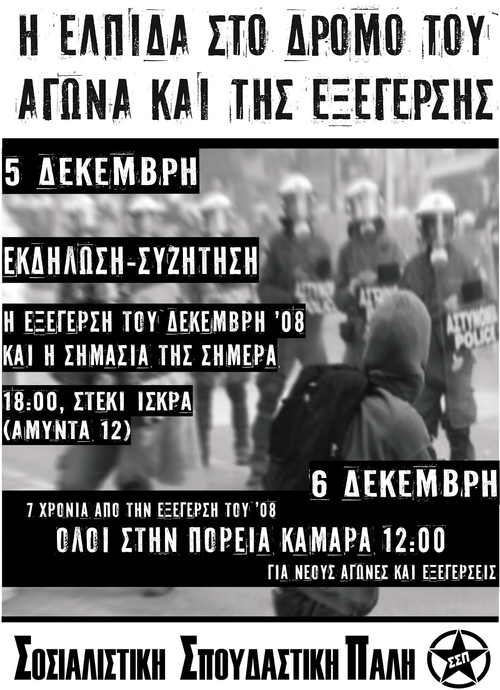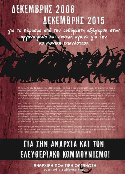 Η εξέγερση του Δεκέμβρη του 2008 καταδεικνύει πως ο κοινωνικός ξεσηκωμός είναι εφικτός, πως η κοινωνική και ταξική αντεπίθεση - σε αντίθεση με την ενσωμάτωση, την παραίτηση και την εξατομίκευση- είναι η μόνη ρεαλιστική προοπτική νίκης των εκμεταλλευόμενων και των καταπιεσμένων. Η εξέγερση του Δεκέμβρη είναι σήμερα ζωντανή ως κοινωνικό πρόταγμα, όχι για την επανάληψή της, αλλά για την υπέρβασή της από τους ίδιους τους αγωνιζόμενους στην προοπτική της κοινωνικής επανάστασης.
