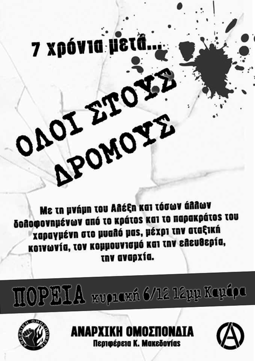 Σήμερα, 7 χρόνια μετά, η Ελλάδα του Αλέξη Γρηγορόπουλου, του Παύλου Φύσσα, του Σαχτζάτ Λουκμάν, του Τόνυ Ονούα, του Χριστόφορου Μαρίνου,του Μιχάλη Καλτεζά, του Κουμή, της Κανελλοπούλου και τόσων άλλων δολοφονημένων από το κράτος και το παρακράτος του, είναι βυθισμένη στην μεγαλύτερη κρίση στην ιστορία της, χωρίς προοπτικές επιστροφής στην εποχή των παχιών αγελάδων Παπανδρέου και Σημίτη, που τόσο αναπολούν οι μικροαστοί. Σήμερα βλέπουμε πιο ξεκάθαρα από ποτέ ότι τη στιγμή που το κεφάλαιο, τραπεζικό, χρηματοπιστωτικό, βιομηχανικό, δείχνει τα δόντια του, χρησιμοποιεί όλο το οπλοστάσιο του, πολιτικούς, μπάτσους, δικαστές, εισαγγελείς, δημοσιογράφους, φασίστες, για να διατηρήσει και να διευρύνει τα προνόμιά του σε βάρος όλων μας, όλων των εργαζομένων, ανέργων, ντόπιων και μεταναστών.