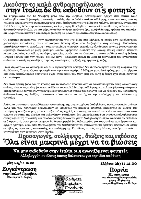 Κείμενο της Ελ.Πα.Π με αφορμή την υπόθεση των 5 διωκόμενων φοιτητών και την έκδοσή τους στη Ιταλία: