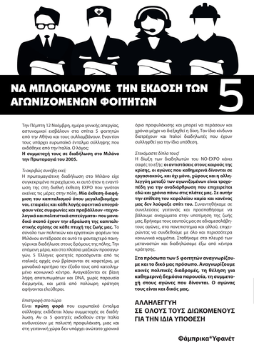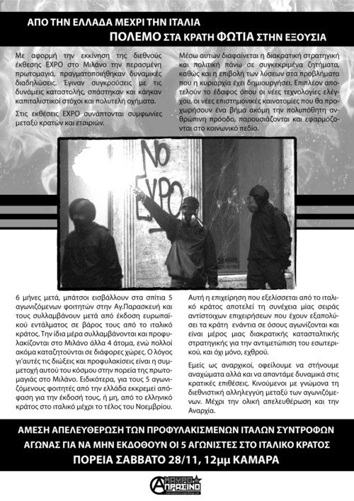 Από την Ισπανία και τις επιχειρήσεις Πανδώρα και Πινιάτα φτάνουμε στο Ευρωπαϊκό Ένταλμα Σύλληψης 5 αγωνιστών, στους οποίους αποδίδεται η κατηγορία εμπλοκής σε επεισόδια στο Μιλάνο δίχως να προσκομιστούν οποιεσδήποτε αποδείξεις. Οι έκνομες πράξεις που αποδίδονται στους φοιτητές εγγίζουν το βαθμό του κακουργήματος κάτι το οποίο επισύρει 8 έως 15 χρόνια φυλάκιση. Φανερό στον καθένα πως η Ευρώπη σφιχτοδένει τους υπηκόους της με το ασφυκτικό λουρί της καταστολής. Η φτώχεια βαθαίνει όπως και η κοινωνική αδικία και μπροστά στα κινήματα που εναντιώνονται στον εξευτελισμό της ανθρώπινης αξιοπρέπειας διεκδικώντας ένα κόσμο ισότητας, δικαιοσύνης και ελευθερίας, η Ευρώπη στενεύει το κλουβί των καταπιεσμένων. Στο όνομα της έκτακτης ανάγκης και της εξωτερικής απειλής πατάσσεται και ο εσωτερικός εχθρός. Τα κράτη βρίσκουν τις κοινές γραμμές τους που τέμνονται τα κοινά συμφέροντα της κυριαρχίας τους και ως καλός υπηρέτης του κεφαλαίου διώκουν τους αντιφρονούντες απέναντι στο πανηγύρι των αφεντικών, στη διεθνή έκθεση EXPO, απέναντι σε ένα σύστημα που βασικό συστατικό έχει την διαίρεση των ανθρώπων και την καταπίεση.