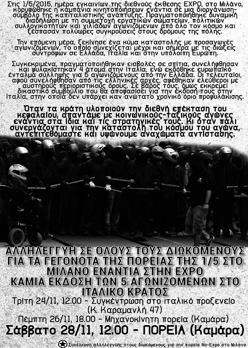 Αλληλεγγύη στους διωκόμενους για τα γεγονότα της πορείας ενάντια στην Expo στο Μιλάνο