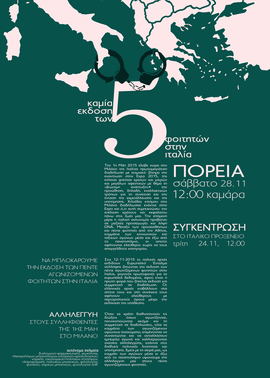 12 Νοέμβρη 2015 : Μέρα γενικής απεργίας. Η ελληνική αστυνομία εισβάλλει στα σπίτια των 5 φοιτητών στην Αγιά Παρασκευή της Αθήνας, κατόπιν έκδοσης Ευρωπαϊκού εντάλματος σύλληψης από το ιταλικό κράτος, το οποίο ζητά την έκδοση των 5 αγωνιστών στην Ιταλία με μοναδικό στοιχείο ότι «εθεάθησαν» να συμμετέχουν στα επεισόδια της πρωτομαγιάτικης απεργίας (χωρίς να διευκρινίζεται από ποιόν και τί εθεάθησαν να κάνουν).