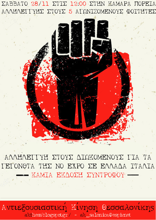 Πορεία αλληλεγγύης στους διωκόμενους του No expo|Σάββατο 28-11, 12:00 Καμάρα