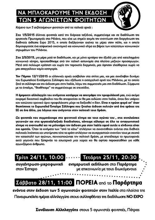 Ως αναρχικοί, στεκόμαστε αλληλέγγυοι στους 5 αγωνιστές φοιτητές που βρίσκονται στο στόχαστρο της κρατικής καταστολής και απαιτούμε να μην εκδοθούν στην Ιταλία όπου αντιμετωπίζουν ποινές φυλάκισης πολλών ετών. Σε μια συνθήκη αναβάθμισης της κατασταλτικής στρατηγικής του κράτους σε μια σειρά από κοινωνικά και ταξικά μέτωπα, οφείλουμε να αναδείξουμε την αλληλεγγύη ως το ισχυρότερο όπλο των εκμεταλλευόμενων και των καταπιεσμένων στον άνισο αγώνα που δίνουν με το κράτος και τα αφεντικά. Σε μία περίοδο κατάρρευσης των αυταπατών περί εναλλακτικής-φιλολαϊκής πολιτικής διαχείρισης εξαιτίας της απροκάλυπτης και συνολικής συστημικής επίθεσης στην κοινωνία και το φυσικό κόσμο, οφείλουμε να αγωνιστούμε με όλες μας τις δυνάμεις για τη δημιουργία ενός πλατιού, μαχητικού και αυτοοργανωμένου κινήματος των από τα κάτω που θα αντιπαλέψει στην πράξη την κρατική τρομοκρατία και την καπιταλιστική βαρβαρότητα και θα θέσει τους όρους για την ανατροπή τους και για τη δημιουργία μιας κοινωνίας ισότητας, αλληλεγγύης και ελευθερίας. Η αλληλεγγύη είναι το όπλο μας!
