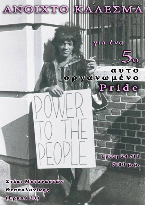Για να μην περιοριστεί πάλι η προσφορά του 5ου Pride σε δύο μέρες «χρονομετρημένης ελευθερίας» και για να μην αποκλείονται οι ριζοσπαστικές φωνές και οι ανάγκες του lgbtqia+ κινήματος, καλούμε όποι@ συλλογικότητα, άτομο ή οργάνωση θέλει να πάρει μέρος στο ανοιχτό κάλεσμα την Τρίτη 24/11, ώρα 19:00 στο Στέκι Μεταναστών Θεσσαλονίκης (Ερμού 23).