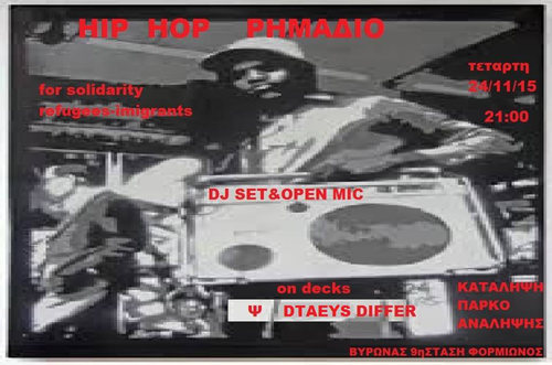 HIP HOP ΚΑΦΕΝΕΙΟ ΑΛΛΗΛΕΓΓΥΗΣ ΚΑΙ ΟΙΚΟΝΟΜΙΚΗΣ ΕΝΙΣΧΥΣΗΣ ΣΕ ΠΡΟΣΦΥΓΕΣ-ΜΕΤΑΝΑΣΤΕΣ ΑΠΟ ΤΗΝ ΑΝΑΡΧΙΚΗ ΟΜΑΔΑ ''ΔΙΑ ΜΗΔΕΝ'' ΜΕ DJ SET&ΟPEN MC SESSION ΑΠΟ DJ DIFFER,Ψ(FRONTAL ATTACK) & D-TAEYS(PRODUCTIVE) ΣΤΗΝ ΚΑΤ.ΑΝΑ.(ΠΡΩΗΝ ΔΗΜΟΤΙΚΟ ΑΝΑΨΥΚΤΗΡΙΟ) ΣΤΟ ΠΑΡΚΟ ΑΝΑΛΗΨΗΣ ΤΟΥ ΒΥΡΩΝΑ!