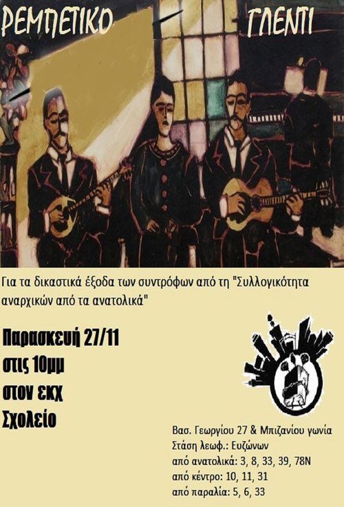 Παρασκευή 27/11 στις 22:00 θ πραγματοποιηθεί ρεμπέτικο γλέντι για την κάλυψη δικαστικών εξόδων των συντρόφων από τη "Συλλογικότητα Αναρχικών από τα Ανατολικά".