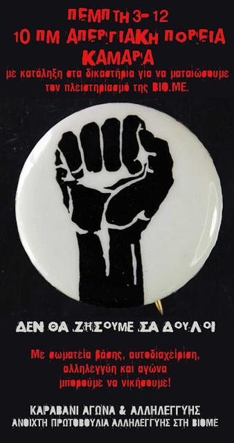 Ως περιφέρεια Κεντρικής Μακεδονίας της Αναρχικής Ομοσπονδίας στηρίζουμε το κάλεσμα της ΒΙΟ.ΜΕ, 3 Δεκεμβρίου 10:00 Kαμάρα.
