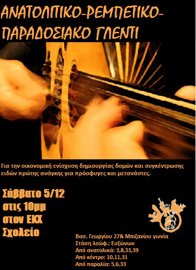 Το Σάββατο στις 10 μμ θα πραγματοποιηθεί Ανατολίτικο-Ρεμπέτικο-Παραδοσιακό Γλέντι για την οικονομική ενίσχυση δημιουργίας δομών συγκέντρωσης ειδών πρώτης ανάγκης για πρόσφυγες και μετανάστες.