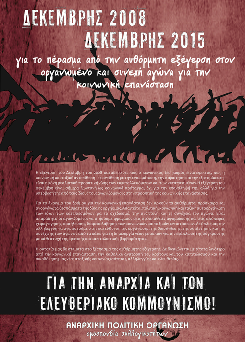Μείναμε όμως και εμείς, όχι για να αμφισβητήσουμε αλλά για να ανατρέψουμε το καπιταλιστικό κράτος και την εξουσία, για την άμεση δημοκρατία και την κοινωνική αντιεξουσία, για μια έξοδο από τη παγκόσμια βαρβαρότητα στην οποία τα κράτη ετοιμάζονται να ξαναβάλουν όλο τον πλανητη.