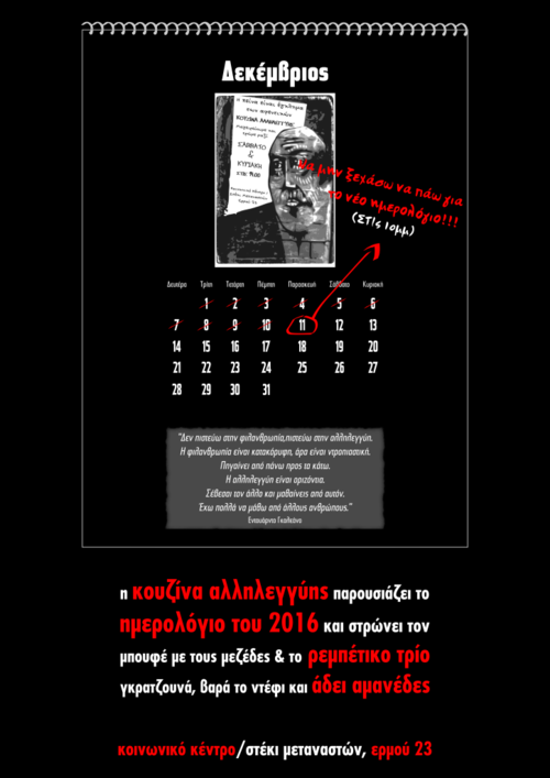 Την Παρασκευή 11/12, εκεί κατά τις 10μμ η Κουζίνα Αλληλεγγύης του Κοινωνικού Κέντρου / Στεκιού Μεταναστών θα παρουσιάσει και θα γιορτάσει με γλεντάκι το ημερολόγιό της για το 2016. Με χρωματάκι αυτή τη χρονιά και με τιμή 3€.