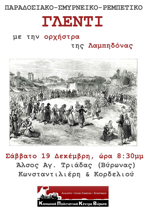 Το Σάββατο 19/12/15 και ώρα 8:30μμ, η ορχήστρα της Λαμπηδόνας θα παρουσιάσει -στο πρώτο μέρος του γλεντιού- τη δομή του μουσικού της εργαστηρίου, ενώ στο δεύτερο μέρος θα επακολουθήσει ολονύχτιο γλέντι με ρεμπέτικα, σμυρνέικα, κρητικά και παραδοσιακά τραγούδια για όλα τα χορευτικά γούστα.