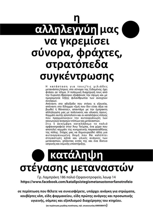 Η Κατάληψη Στέγης Μεταναστών (παλιό Ορφανοτροφείο) καλεί σε πορεία αλληλεγγύης στους μετανάστες στις 6μμ στην Καμάρα.