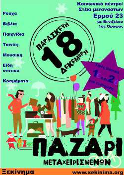 Έχουμε μαζέψει πράγματα που δεν χρειαζόμαστε (ρούχα, βιβλία, ταινίες, μουσική, είδη σπιτιού, κτλ) από συγγενείς και φίλους- φέρνετε και εσείς αν θέλετε και έχετε. Τα τακτοποιούμε και τα "τιμολογούμε", ώστε να βγεί από αυτό μια οικονομική ενίσχυση που θα στηρίξει τις εκστρατείες μας. Βρισκόμαστε και κάνουμε τις "αγορές" μας ή παίρνουμε τα δώρα μας για τις γιορτές (θα υπάρχει άφθονο χριστουγεννιάτικο χαρτί περιτυλίγματος)