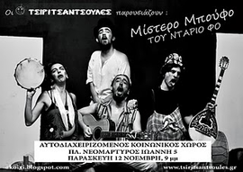Ο Γελωτοποιός, ο Άγγελος, ο Εργάτης, η Μάνα, ο Μέθυσος, ο Τρελός, ο Κουτσός κι ο Τυφλός, σας επισκέπτονται στον τόπο σας και παρασταίνουν αρχαίες ιστορίες μέσα από τις διαχρονικές τεχνικές των πλανόδιων γελωτοποιών από την αρχαιότητα ως τις μέρες μας.