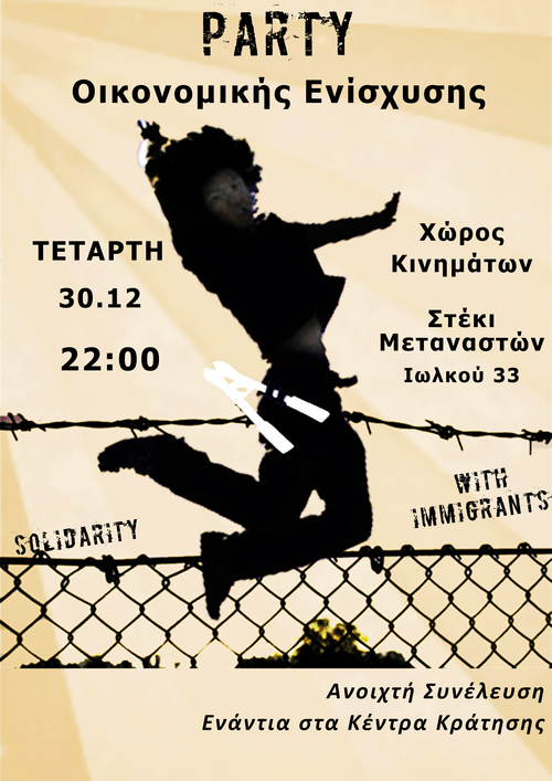 Την Τετάρτη στις 30 Δεκεμβρίου στο Χώρο κινημάτων-στέκι μεταναστών στις 22.00, θα γίνει Πάρτυ -Μπάρ με σκοπό την οικονομική ενίσχυση της Ανοιχτής Συνέλευσης Ενάντια στα Κέντρα Κράτησης