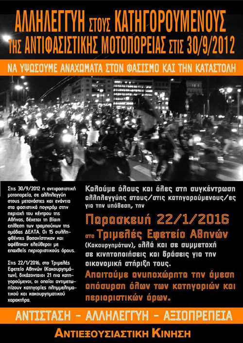 Την Παρασκευή 22 Γενάρη 2016 έχει οριστεί να ξεκινήσει στο Τριμελές Εφετείο Κακουργημάτων της Αθήνας η δίκη των 21 αντιφασιστών/στριών που κατηγορούνται με βάση τη συμμετοχή τους στην 3η Αντιφασιστική Μοτοπορεία της 30/9/2012 στις συνοικίες της Κυψέλης, των Πατησίων και της Πλατείας Αμερικής. Πρόκειται για τους 15 αντιφασίστες και αντιφασίστριες που συνελήφθησαν κατά τις επιδρομές των αστυνομικών δυνάμεων στην πορεία, για να αφεθούν αργότερα στη βασανιστική «αγκαλιά» των δημοκρατικών δυνάμεων του νόμου και της τάξης στη ΓΑΔΑ, και 6 ακόμα συντρόφους που κατηγορήθηκαν με βάση τους αριθμούς πινακίδων οχημάτων που εγκαταλείφτηκαν κατά τη διάρκεια των παραπάνω επιδρομών. Και οι 21 έχουν αναλάβει στην ανάκριση την ευθύνη και έχουν υπερασπιστεί πολιτικά τη συμμετοχή τους στην πορεία, κάτι το οποίο θα κάνουν και στην αίθουσα του δικαστηρίου.