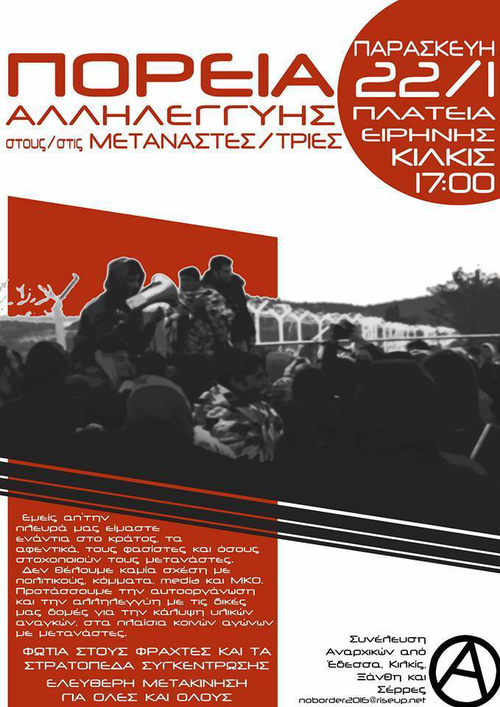 Στην Ελλάδα το "αριστερό" κράτος, πιστός διαχειριστής όλων των ευρωπαϊκών αντι-μεταναστευτικών πολιτικών, συνεχίζοντας την ίδια στρατηγική με την αύξηση του χρόνου εγκλεισμού στα στρατόπεδα συγκέντρωσης, τη βίαιη καταστολή τους όταν αντιστέκονται στις άθλιες συνθήκες κράτησης, την εκκένωση της Ειδομένης, στέλνει παράλληλα περιοδεία τους βουλευτές του να εκφοβίσουν τους αλληλέγγυους σε περίπτωση που δεν "συνεργαστούν" με τις επιταγές του Υπουργείου. Η "κυβέρνηση της αριστεράς" έφτασε μέχρι και στη ποινικοποίηση των αυτοοργανωμένων δομών αλληλεγγύης στους μετανάστες. Χαρακτηριστικό είναι το παράδειγμα στη Λέσβο όπου αλληλέγγυοι όχι μόνο εμποδίστηκαν από το να μοιράσουν φαγητό στους μετανάστες αλλά τους συνέλαβαν και μάλιστα με κατηγορίες για διακίνηση ανθρώπων. Στην Θεσσαλονίκη, η Κατάληψη Στέγης Μεταναστών Μεταναστριών «Ορφανοτροφείο» δέχθηκε, από την πρώτη μέρα κιόλας, απειλές από την Εκκλησία Α.Ε. στην οποία ανήκει το κτήριο. Σκοπός των απειλών, οι οποίες συνοδεύτηκαν τις πρώτες μέρες λειτουργίας του εγχειρήματος από συγκέντρωση παπάδων έξω από την κατάληψη, από απόπειρα κοψίματος του ρεύματος και από κείμενο της "Επιτροπής Κατοίκων Τούμπας" ενάντια στην κατάληψη, ήταν να εκκενωθεί το κτίριο ώστε αυτό να κατεδαφιστεί.
