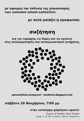 Με αφορμή την παρουσίαση του εντύπου "με αυτό μοιάζει η ομφφωνία" των common wheel collective μία συζήτηση για την ιεραρχία, τις δομές και τις σχέσεις στις δομές του ανταγωνιστικού κινήματος.