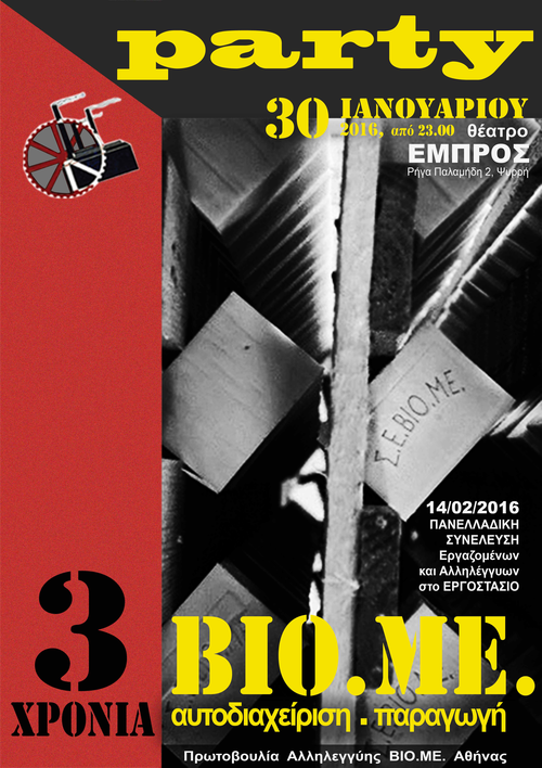Πάρτι οικονομικής ενίσχυσης της Πρωτοβουλίας Αλληλεγγύης (Αθήνας) στη ΒΙΟΜΕ, στο ελεύθερο αυτοδιαχειριζόμενο θέατρο ΕΜΠΡΟΣ (Ρήγα Παλαμήδη 2, Ψυρρή).