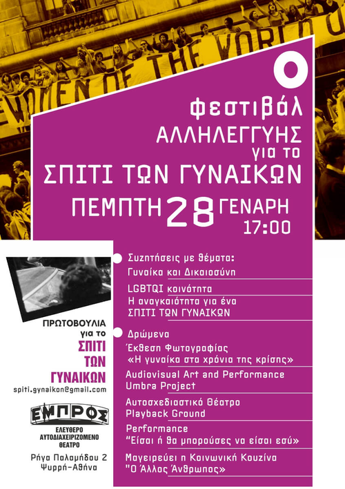Με το 1ο Φεστιβάλ Αλληλεγγύης για το «Το Σπίτι των Γυναικών» που θα γίνει την Πέμπτη, στις 28 Γενάρη στο «Ελεύθερο Αυτοδιαχειριζόμενο Θέατρο Εμπρός» θέλουμε να δώσουμε συνέχεια και αίσιο τέλος στην καμπάνια για ένα "Σπίτι των Γυναικών", που άρχισε πέρσι!
